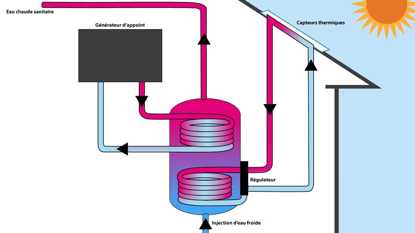 À travers le circuit de canalisations qui est totalement hermétique, le fluide caloporteur composé d’eau glycolée (antigel) transporte la chaleur absorbée auparavant jusqu’au ballon de stockage en forme de cuve.